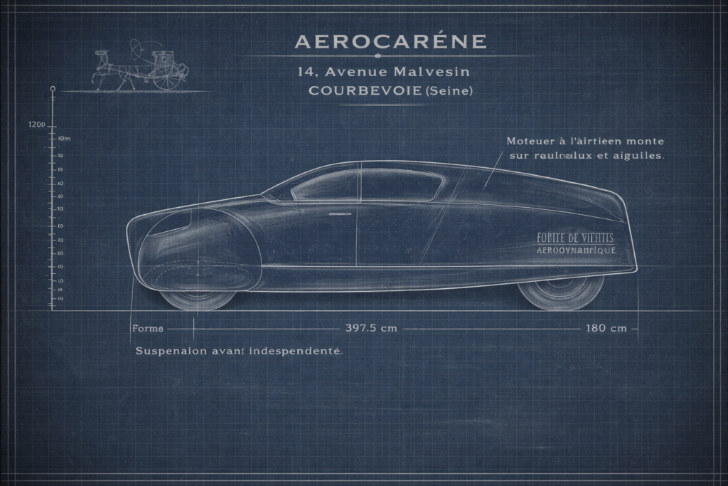 L’Aerocarène est pensée avec les outils de l’aéronautique : aérodynamique optimisée, poids minimal, structure simplifiée et consommation extrêmement réduite. Mais surtout, elle introduit une idée fondatrice : la performance utile compte plus que la puissance. Le choix radical : enlever plutôt qu’ajouter Là où l’industrie automobile a historiquement ajouté, les ingénieurs de l’Aerocarène retirent : une roue en moins, moins de matière, moins de complexité. Résultat : une voiture plus légère, plus sobre, plus simple. Une vision étonnamment moderne Ce projet résonne aujourd’hui avec les enjeux contemporains : sobriété énergétique, efficacité, design fonctionnel.