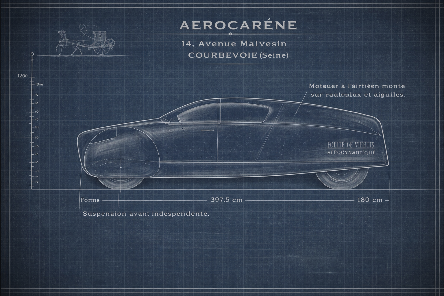 1.8 La ligne de « l’AEROCARENE » très sobre, semble heureuse, elle est uniquement la conséquence d’une adaptation très poussée des formes à leur objet. Cette esthétique quoique d’origine purement technique, ne choque pas des yeux habitués aux formes des avions et des navires.